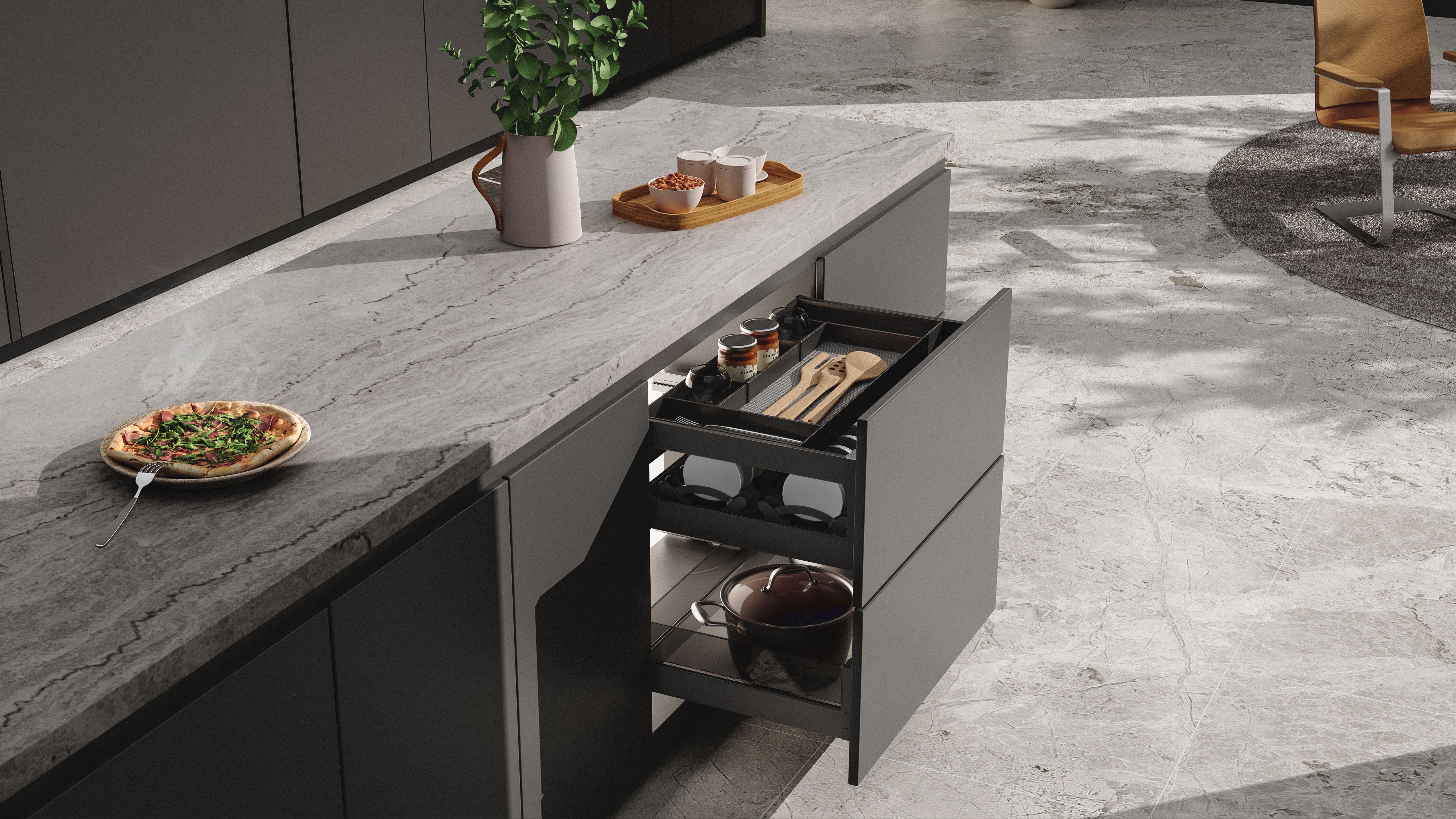 Trilho oculto com extração total, capacidade de carga de até 35kg e amortecimento integrado para fechamento suave. Poss…